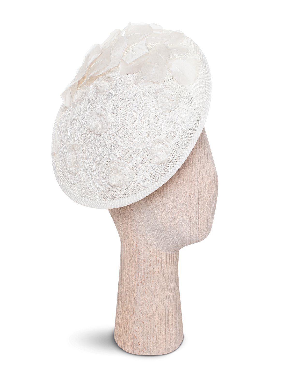 Beautiful disc hat in tones of soft white sinamay adorned with Solstiss lace and silk petals.